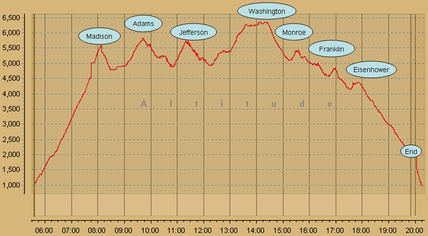 Zero views all day, a blur of rocky summits, wetter than a sponge, visions of pizza and beer – that’s how it was as we bagged each President in the series. Madison, Adams, Jefferson – see ya wouldn’t wanna be ya. Now Mt. Washington posed a serious challenge. Lactic acid bogged down my legs, each .1 mile became a test of willpower.